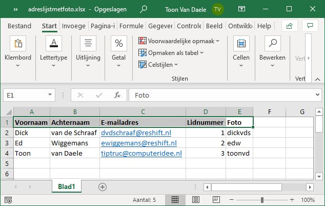 Laten we beginnen met het aanmaken van de datatabel in Excel. In de opeenvolgende cellen van de bovenste rij (A1, B1, C1, D1 enzovoort) tik je telkens een duidelijk trefwoord in dat de informatie in de rijen aanduidt. Dat kan iets worden als Voornaam (voor cellen A2, A3, A4), Achternaam (B2, B3, B3), E-mailadres (C2, C3, C4), Lidnummer (D2, D3, D4) en Foto (E2, E3, E4). Let op, in de laatste kolom plak je niet de foto, maar alleen een link naar de naam van het fotobestand, zoals Foto1. Inderdaad, zonder padnaam en ook zonder extensie. Bewaar de tabel in Excel.