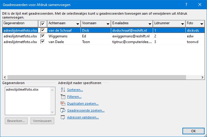 We gaan opnieuw gegevens uit een Excel-tabel ophalen. Deze keer gaat het om specifieke data: namen, adressen en, omdat dat best leuk is, een of meer foto’s die bij elk record horen. Het is de bedoeling dat we die data een voor een ophalen en in Word in een gepersonaliseerde brief of e-mail stoppen.