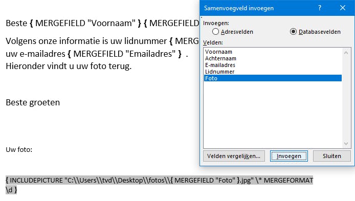 Tik nu de tekst in die je in de brief naar alle geadresseerden wilt opnemen. De eigenlijke variabelen laat je op dit moment nog oningevuld. Dat wordt dus zoiets als “Beste, volgens onze informatie is je lidnummer en je e-mailadres. Hieronder vind je je foto terug. Vriendelijke groeten”.