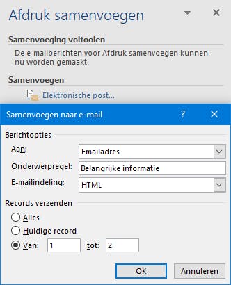 We hebben hiervoor bij de verzendlijst gekozen voor brieven, maar een ander mogelijk documenttype is E-mailberichten. Dit type is handig wanneer je de geadresseerden liever mailt dan benadert via de post. Zo’n opzet is perfect haalbaar, maar om een of andere reden lukt het niet met gepersonaliseerde foto’s. Wel blijft het mogelijk om in je bericht statische afbeeldingen en andere grafische elementen op te nemen.