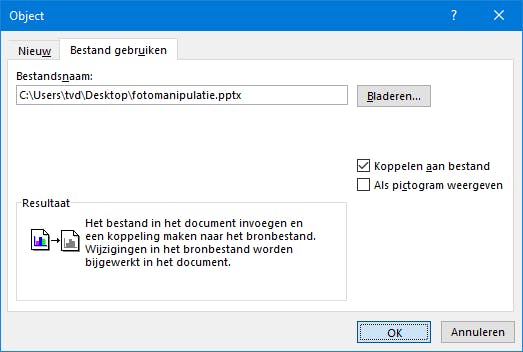 Open in Word het tabblad Invoegen en klik in de rubriek Tekst op het pijltje naast Object. Selecteer nogmaals Object en open het tabblad Bestand gebruiken. Navigeer via Bladeren naar je pptx-bestand en bevestig je keuze met Invoegen. Plaats een vinkje bij Koppelen aan bestand en plaats eventueel een vinkje bij Als pictogram weergeven. Zodra je bevestigt met Ok wordt de dia (of het pictogram) in Word toegevoegd.