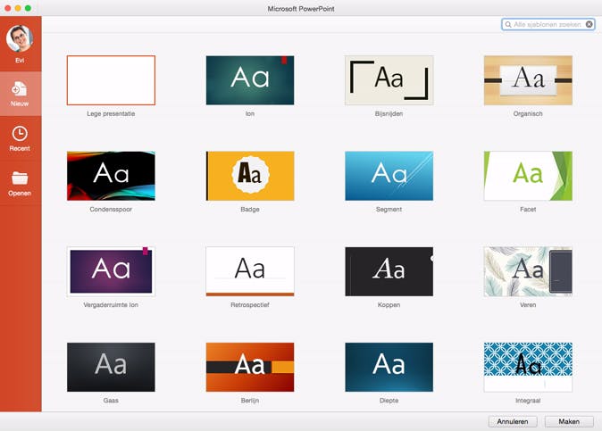 De look and feel van Office voor Mac is behoorlijk bijgeschaafd. Alles ziet er een stuk strakker uit - inclusief de Word- en Excel- sjablonen en Powerpoint-thema's - en bestanden delen is makkelijker dan ooit. Via Bestand > Delen kun je iemand uitnodigen om samen te werken aan je document, spreadsheet of presentatie.