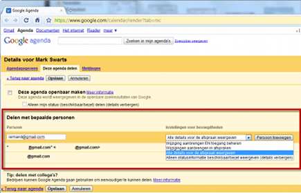 U deelt uw agenda met vrienden en collega's door hun mailadressen in te vullen en vervolgens wat details aan te passen.