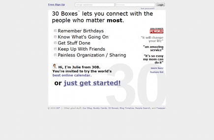De Amerikaanse agenda en 'to-do'-dienst 30 Boxes is in veel landen razend populair. Dat is niet vreemd, als u ziet hoe snel en effectief de website van deze dienst werkt. Surf naar 30 Boxes, klik op Just get started en registreer uzelf (via de toegezonden mail). Vervolgens komt u in een wizard terecht waarin uw Facebookpagina, het lokale weerbericht en de url's van een blog en een Flickr-pagina kunnen worden ingevuld, zodat al deze diensten worden geïntegreerd binnen de agenda. Klik daarna op Next. In de volgende stap vult u de data van belangrijke verjaardagen in. Dit moet overigens wel op de Amerkaanse manier worden gedaan, bekijk dus eerst even het voorbeeld op de website. In de derde stap maakt u een contactpersonenlijst aan, zodat u later uw agenda naar vrienden of collega's kunt mailen. In de vierde stap van de wizard wordt uitleg gegeven over welke stappen u verder nog kunt volgen. Denk daarbij aan het indelen van de agenda, het delen van afspraken en de mogelijkheid om de agenda een persoonlijke tint mee te geven door thema's te gebruiken.