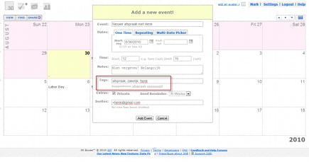 Om een agendapunt in te voeren, klikt u in het lege invulvak boven de agenda. Vul hier een titel in en klik op Add. Het agendapunt is nu ingevoegd op de huidige dag, maar het kan worden versleept naar de gewenste datum. Bij het genoemde vak vindt u ook de optie Detailed entry, waarbij de juiste datum (of meerdere data, via Multi-Date picker) kan worden ingevoerd. Ook kunt u Private aanklikken en een herinnering instellen via het menu Reminder. Door tags of labels in te voeren zijn agendapunten later gemakkelijker terug te vinden, via de knop Find die u in het menu ziet. Via datzelfde menu kan de agenda van een dag, week of maand worden geprint (via View) of worden gedeeld met bekenden (Share).