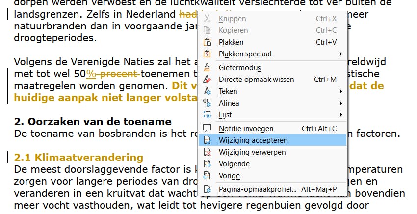 Een eerste opvallende vernieuwing is de manier waarop je tijdens het samenwerken veel duidelijker zicht krijgt op de voorgestelde wijzigingen. Activeer dit via Bewerken / Wijzigingen / Wijzigingen bijhouden of met de sneltoets Ctrl+Shift+C. Vanaf dat moment markeert Writer automatisch alles wat je typt, verplaatst of aanpast.