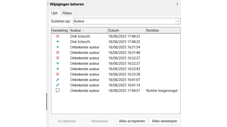 Nu kun je niet alleen sneller door honderden wijzigingen bladeren, maar ook instellen hoe elk type wijziging wordt weergegeven, van kleur tot markering. Met de knoppen Accepteren en Verwerpen beslis je per wijziging of je alles in één keer verwerkt. Bovendien kun je de lijst filteren op auteur en/of tijdstip, wat vooral bij samenwerking met meerdere gebruikers tijd bespaart.