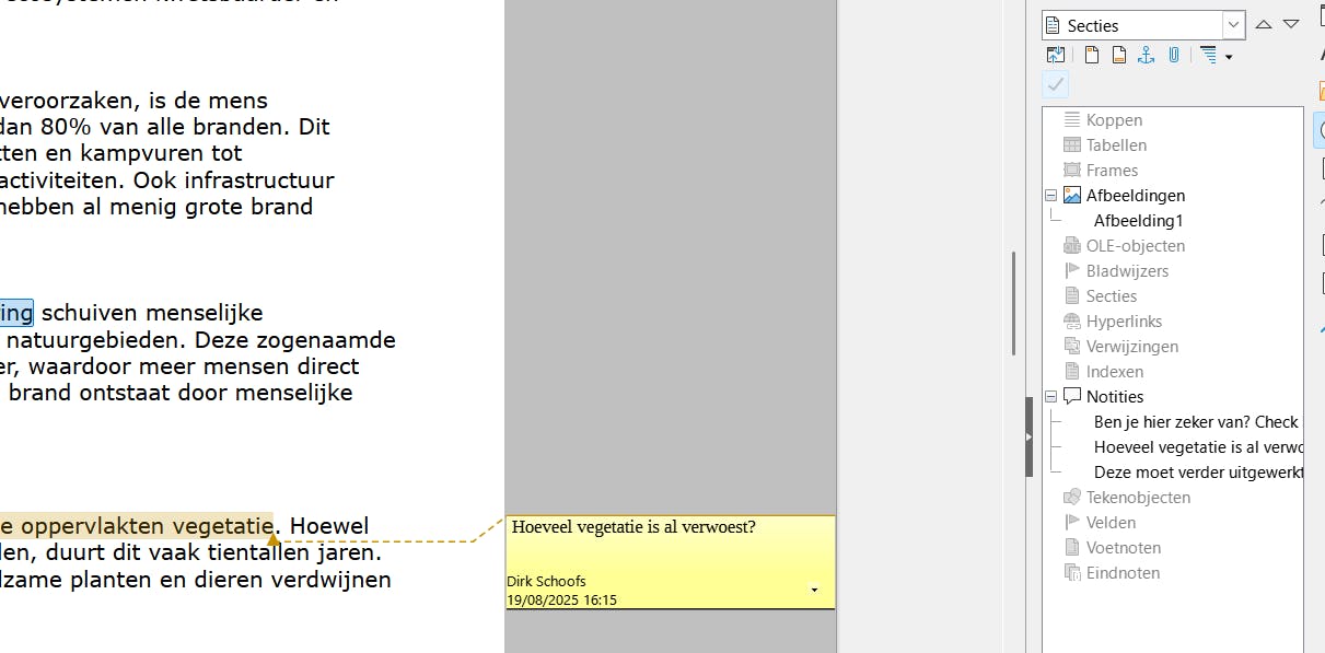 Commentaren zijn in de nieuwe versie beter geïntegreerd in de Navigator, waardoor je ze als overzichtslijst kunt gebruiken. Open het zijpaneel Navigator met F5 of via het kompas-pictogram in de zijbalk. Vanuit dit venster navigeer je met één klik naar koppen, afbeeldingen, secties en tabellen. Voeg je in de tekst een commentaar toe via rechtermuisknop en de optie Notitie toevoegen of de sneltoets Ctrl+Alt+C, dan verschijnt deze niet alleen in de tekst, maar ook in de Navigator. Klik je daar op een commentaar, dan springt Writer meteen naar de juiste plaats in het document.