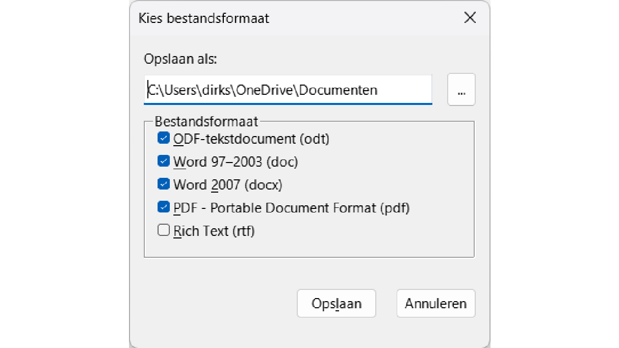 Eerst moet je de extensie installeren via het menu Extra / Extensies. Daar klik je linksonder op de knop Haal meer extensies online. Dan kom je in een store om extensies te zoeken en te downloaden. Wanneer de download binnen is, dubbelklik je op het bestand multiformatsave-v1-5-6.oxt in de map Downloads. Er verschijnt een waarschuwing die aangeeft dat je op het punt staat om een extensie te installeren voor LibreOffice. Klik op OK. Daarna moet je LibreOffice opnieuw opstarten. Vanaf nu heb je in het menu Bestand een nieuwe functie: Multi Opslaan als. Als je die functie aanspreekt, krijg je een pop-up waar je verschillende indelingen kunt selecteren. Via Extra / Extensie kun je achteraf ook extensies verwijderen.
