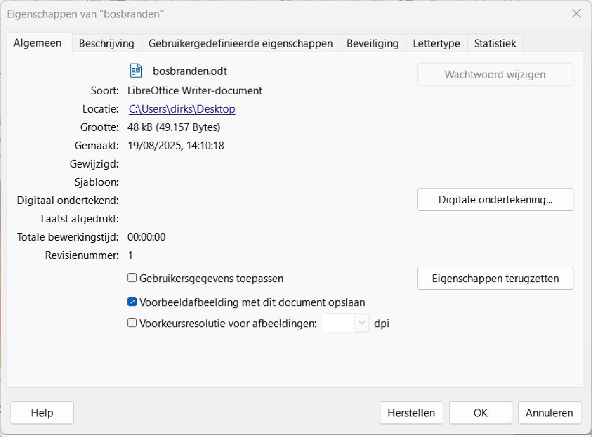 Klik op de knop Eigenschappen terugzetten. Hiermee wis je auteur, wijzigingsdatum, bewerkingstijd en woordentelling. Sla het bestand dan opnieuw op. Wil je het programma instellen zodat je de metadata altijd wist bij het opslaan, zodat je dit niet kunt vergeten? Ga naar Extra / Opties. Kies links in de lijst LibreOffice / Beveiligen. In de groep Beveiligingsopties en waarschuwingen klik je op de knop Opties. Daarna vink je de optie aan: Persoonlijke informatie verwijderen bij het opslaan. Bevestig met OK. Vanaf nu worden alle documenten automatisch schoon opgeslagen.