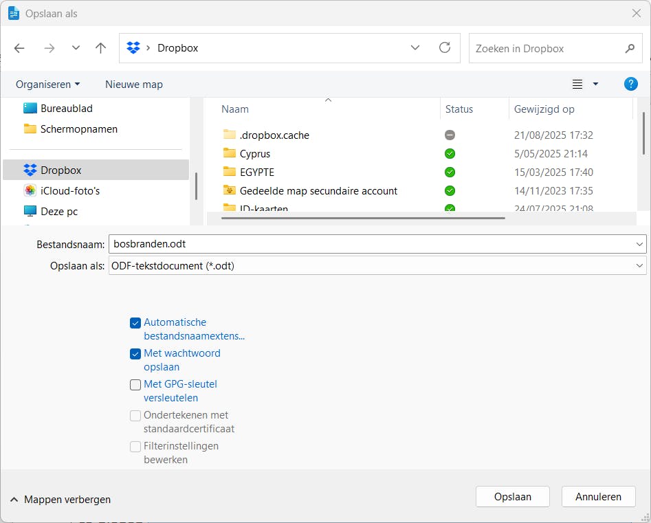 Onder het menu Bestand vind je ook de optie Extern opslaan. Hiermee sla je een bestand op een andere locatie op dan je eigen computer. Dit kan bijvoorbeeld een netwerkschijf of gedeelde map zijn, via WebDAV, FTP, SSH of een andere netwerkverbinding, of in een cloudomgeving zoals Nextcloud, Google Drive of OneDrive.
