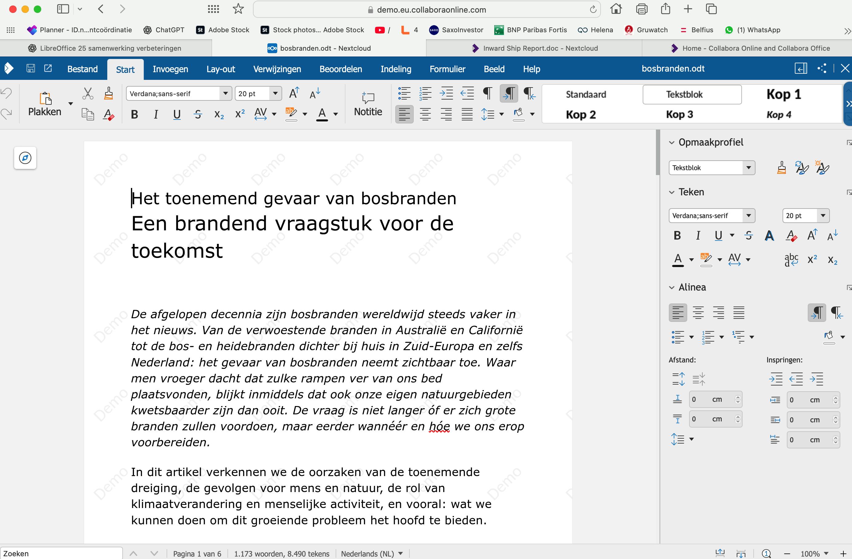 Wanneer een document geopend is, herken je meteen de vertrouwde LibreOffice-modules. De interface van Collabora Online is niet 100 procent identiek aan de desktopversie van LibreOffice, maar de functies en compatibiliteit zijn zeer vergelijkbaar. De interface past zich aan de taalinstellingen van je systeem aan (in ons geval Nederlands). Je kunt elk bestand bewerken en opslaan in verschillende formaten. Zo kun je een geopende odp-presentatie bewaren als odf-presentatie, PowerPoint-bestand (.pptx) of PowerPoint 2003-presentatie (.ppt). Een tekstdocument in odt-formaat kun je opslaan als rtf, Word (.docx) of Word 2003-document (.doc). Ook exporteren naar pdf of epub is mogelijk. Alles gebeurt volledig in de internetbrowser, zonder dat je een lokale toepassing nodig hebt. Bovendien ben je niet beperkt tot de demo-bestanden: je kunt zelf ook eigen bestanden uploaden, bewerken en opslaan in deze indelingen.