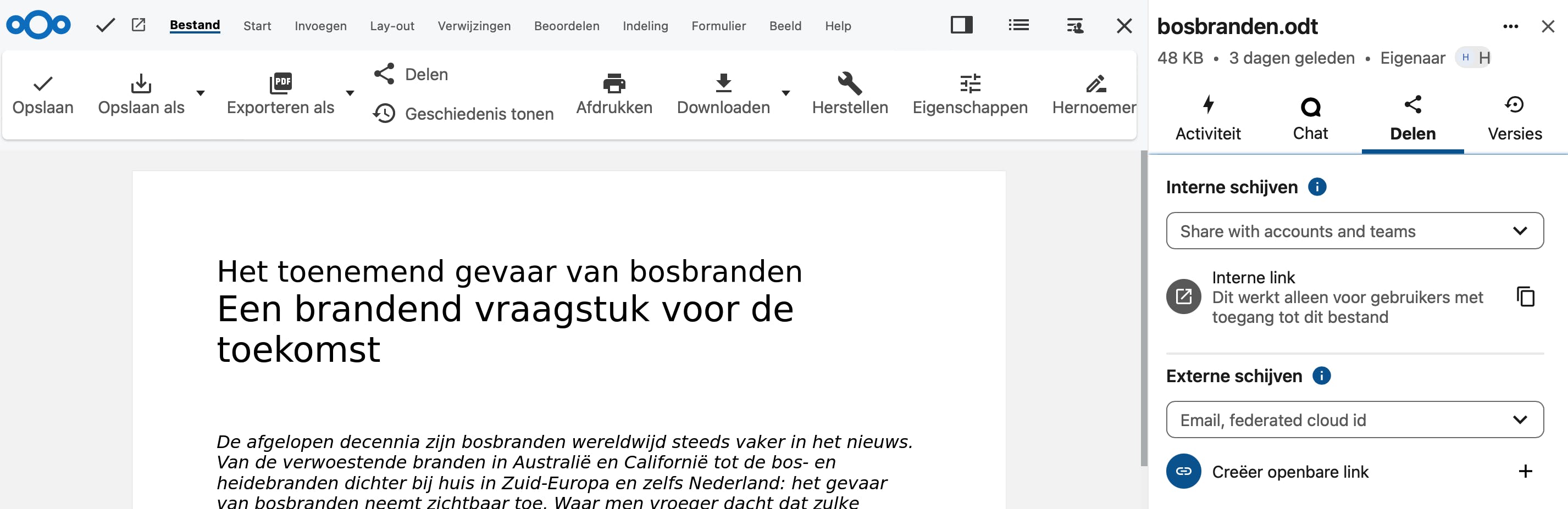 In Nextcloud klik je op de Deel-knop en voeg je een gebruiker of groep toe. Je kunt zelfs een openbare link aanmaken. Daarbij bepaal je of de ander het document alleen mag lezen of ook mag bewerken. Vanaf dat moment kunnen meerdere mensen tegelijk in hetzelfde document werken. Elke auteur krijgt een eigen kleur voor de cursor en de selecties en alle wijzigingen verschijnen direct op het scherm. Net als in de desktopversie kun je opmerkingen toevoegen en wijzigingen bijhouden. Ondertussen kun je chatten en altijd teruggaan naar eerdere versies.