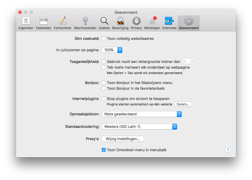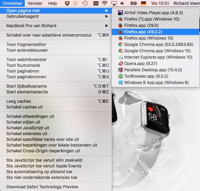 Als een webpagina niet goed wordt weergegeven, kun je snel even kijken hoe de desbetreffende pagina er bijvoorbeeld in Firefox of Chrome uitziet. Deze applicaties moeten wel op je Mac zijn geïnstalleerd. Ga naar Ontwikkel / Open pagina met en kies de applicatie naar keuze.