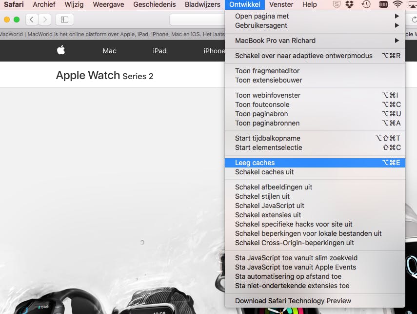 De toetscombinatie voor het legen van de cache is Alt-Cmd-E. Je kunt ook de caches compleet uitschakelen door op Schakel caches uit te klikken.