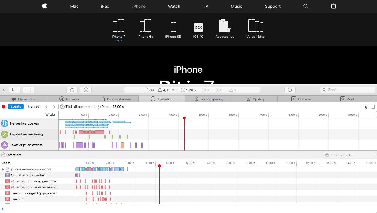 Bovenin het infovenster zie je hoe lang het duurt voordat een pagina volledig geladen is. Wil je precies weten wat er wanneer geladen wordt, dan kun je op Tijdbalken klikken en de pagina opnieuw laden. Je ziet nu precies op welk moment welk onderdeel aan de beurt is. Handig om op te sporen wat voor vertraging op een website zorgt.