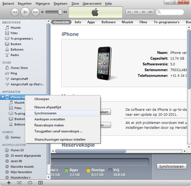 Wanneer de update voltooid is, beschikt uw apparaat over iOS 5, maar is helemaal leeg. Klik nu wederom met de rechtermuisknop op het apparaat en kies voor Reservekopie terugzetten. Zodra dit is gedaan (dit kan wel even duren), synchroniseert u het apparaat met uw iTunes-bibliotheek (waarnaar u eerder de aankopen hebt overgezet), en u hebt iOS 5 en uw eigen gegevens.