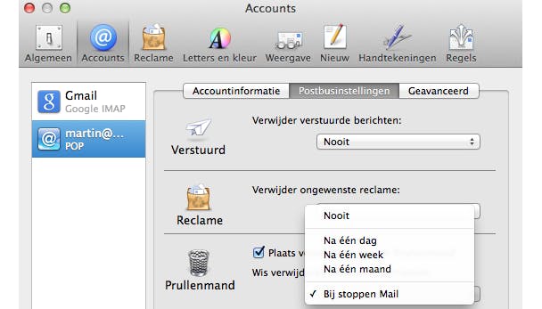 Het kan natuurlijk ook zijn dat je helemaal geen prijs stelt op het bewaren van verwijderde mail, immers, je hebt ervoor gekozen om ze te verwijderen. In dat geval kun je er ook voor kiezen om de hele prullenmand-stap over te slaan. Navigeer in Mail wederom naar Mail / Voorkeuren / Accounts. Bij het kopje Prullenmand, klik je op het uitklapmenu bij het kopje Wis verwijderde berichten permanent en vervolgens op Bij stoppen Mail. Wanneer je nu voortaan Mail afsluit, zullen alle berichten die je verwijderd hebt, ook echt verwijderd worden.
