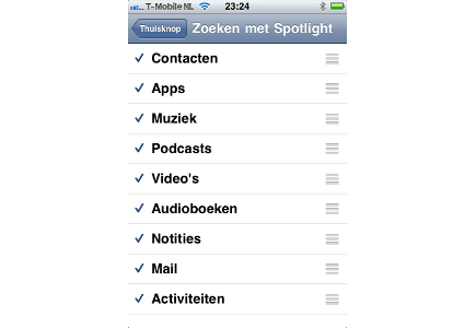Spotlight is een zeer handige zoekfunctie, waarmee u van alles op uw telefoon kunt vinden, zoals contactpersonen, muziek, video’s, mail enzovoort. Allemaal leuk en aardig, maar om deze inhoud direct te kunnen tonen terwijl u het intypt, moet de inhoud van uw iPhone worden geïndexeerd. Ook hier wordt de iPhone flink trager van. Gelukkig kunt u ook deze optie uitschakelen. Klik op Instellingen / Algemeen en vervolgens op Thuisknop. In het venster dat verschijnt, scrolt u naar beneden en drukt u op Zoeken met Spotlight. U ziet nu een lange lijst met opties die geïndexeerd kunnen worden, en ze zijn allemaal aangevinkt. Raak ze stuk voor stuk aan om de vinkjes te verwijderen. Gebruikt u Spotlight extreem vaak om contactpersonen te zoeken, dan kunt u de optie Contacten natuurlijk aan laten staan, maar het is net zo makkelijk om uw favoriete personen in te stellen als favoriet het telefoonboek van de iPhone. Het uitschakelen van het indexeren levert de grootste snelheidswinst op, al wordt een oudere iPhone uiteraard nooit zo snel als de iPhone 4.
