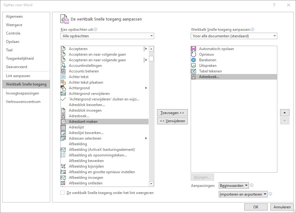 Hierdoor opent het venster Opties voor Word in de rubriek Werkbalk Snelle toegang. Bovenaan kun je standaard kiezen uit Populaire opdrachten, maar daar vind je niet wat je nu nodig hebt. Wijzig dit in Alle opdrachten zodat je een alfabetisch geordende lijst krijgt van alle opdrachten die beschikbaar zijn. Selecteer in deze lange lijst de opdracht Adresboek en gebruik daarna de knop Toevoegen. Bevestig met OK om dit venster te sluiten.