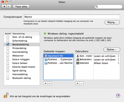 Binnen Systeemvoorkeuren geeft u aan welke mappen u wilt delen.