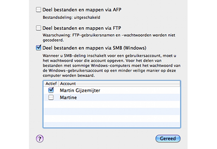 De mappen die u hebt toegevoegd worden nu gedeeld met anderen die u daarvoor hebt gemachtigd, maar Windows 7 kan er nog altijd niet bij. U dient OS X specifiek te vertellen dat de mappen moeten worden gedeeld voor Windows. U doet dit door op de knop Opties te klikken boven het veld Gebruikers. In het venster dat verschijnt, plaatst u een vinkje bij de optie Deel bestanden en mappen via SMB (Windows). SMB is een netwerkprotocol dat staat voor Server Message Block. Onder in het venster zit u een veld waar u een gebruiker kunt selecteren. De gebruiker die u hier selecteert, bepaalt de lees- en schrijfrechten die de Windows-gebruiker voor de gedeelde mappen heeft. Klik de gewenste gebruiker aan en vul het bijbehorende accountwachtwoord in. De gedeelde mappen zijn nu gedeeld met Windows. Open binnen Windows de Verkenner en klik op Netwerk. U ziet nu de gedeelde Mac verschijnen. Wanneer u erop klikt, dient u nog eenmaal de gebruikersnaam en het wachtwoord van het gebruikersaccount op de Mac in te geven en u kunt de Mac-mappen zonder problemen benaderen en bewerken.