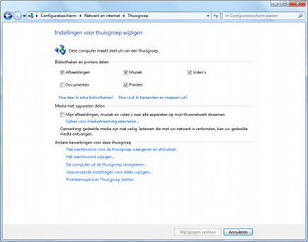 De mappen op de Mac zijn nu weliswaar zichtbaar binnen Windows, maar andersom is er van uw Windows-pc nog geen spoor te bekennen op de Mac. Voordat we dat gaan realiseren is het wederom belangrijk eerst te bepalen welke mappen er gedeeld worden en sowieso dát er mappen gedeeld worden. Klik op Start / Configuratiescherm en vervolgens op Opties voor thuisgroepen en delen selecteren. Vink de onderdelen aan die u wilt delen (dit zijn nog niet de mappen, dat komt zo) en klik op OK. Zorg ervoor dat u hier in ieder geval Printers aanvinkt, zodat het ook mogelijk is om vanaf de Mac te printen (meer hierover bij Printerdeling). Wilt u vervolgens nog afzonderlijke mappen delen, blader dan naar de betreffende map in de Verkenner, klik erop met de rechtermuisknop en kies voor Delen met / Thuisgroep (Lezen/schrijven) ervan uitgaande dat u de Mac die rechten wilt geven. U kunt ook de gehele C-schijf delen, kies dan voor Delen met / Geavanceerd delen / Geavanceerd delen / plaats een vinkje bij Deze map delen. Klik op OK.