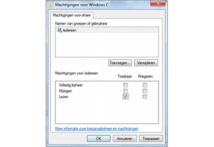 Wanneer u een hele schijf deelt, besluit Windows standaard dat de partij met wie u deze schijf deelt alleen maar leesrechten heeft. Dit is ter beveiliging van uw bestanden. Wilt u dit aanpassen, klik dan in het venster Geavanceerd delen op Machtigingen onderaan. U kunt dan aangeven of de mappen en bestanden ook gewijzigd kunnen worden of zelfs volledige beheersrechten toekennen met betrekking tot de mappen. U kunt uiteraard ook bepaalde rechten toekennen aan bepaalde gebruikers, als u meer controle wilt hebben.