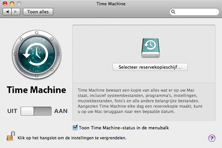 De website van de oorspronkelijke makers (Xiotios) lijkt niet meer actief te zijn, maar het programma is nog wel te vinden op internet. Download het programma, open het en klik op Enable Airdisks. Nu kunt u back-ups wegschrijven op uw gedeelde Windows-schijven (zoals die van een computer met een grote harde schijf voor back-ups). Klik op Systeemvoorkeuren en vervolgens op Time Machine. Klik op Selecteer reservekopieschijf en selecteer de map waarop u de back-ups wilt opslaan, en klik op Gebruik voor reservekopie. Klik nu op Aan om het proces van automatische back-ups te starten.