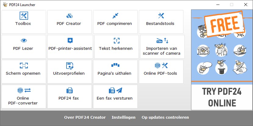 PDF24 bestaat uit verschillende (hulp)programma’s. Die staan nu allemaal op je pc of laptop. Na afloop van de installatie verschijnen er twee nieuwe pictogrammen op het bureaublad, namelijk PDF24 Toolbox en PDF24 Launcher. De Toolbox geeft je toegang tot tientallen functies. Voer daarmee verschillende pdf-taken stap voor stap uit. De Launcher is een overkoepelend programma waarmee je onder andere diverse instellingen van PDF24 Creator naar je hand kunt zetten. Bovendien controleer je daarmee ook of er nieuwe updates zijn.