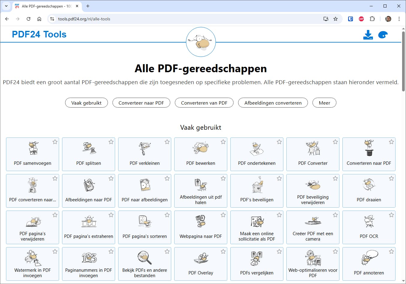 Wil je af en toe eens een pdf-document bewerken? Wanneer jouw computer met internet is verbonden, kun je als alternatief ook de webversie van PDF24 Tools gebruiken. Bezoek met een willekeurige browser maar eens deze site. Zoals je ziet, zijn de online mogelijkheden groot. Het voordeel is dat deze tooltjes ook op systemen met andere besturingssystemen beschikbaar zijn, zoals macOS, iOS, Linux en Android. Houd er rekening mee dat bestanden tijdelijk op Europese servers terechtkomen. Mogelijk is de verwerkingstijd om die reden iets langer. Belangrijk om te weten is dat PDF24 jouw documenten niet analyseert. Bovendien wist de dienst na korte tijd automatisch alle gegevens. Ten opzichte van de installatieversie werken veel pdf-gereedschappen trouwens exact hetzelfde. Volg voor instructies de resterende tips in dit artikel.
