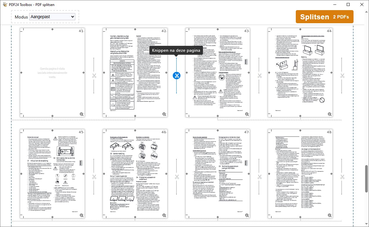 Open in PDF24 Toolbox het onderdeel PDF Splitsen. Selecteer met behulp van Bestanden kiezen het pdf-bestand in de Verkenner en kies Openen. Je kunt op verschillende manieren splitsen. Een goede methode is om een paginabereik op te geven. Klik achter Modus op het kleine pijltje en kies Aangepast. Elke pagina verschijnt als miniatuurweergave. Klik op het schaartje tussen twee pagina’s om het juiste knipmoment te bepalen. Je kunt zo op meerdere plekken splitsen. Gebruik het kleine plusteken rechtsonder een pagina om een vergrote weergave te tonen. Dat helpt je wellicht om binnen het document op de juiste plek(ken) te splitsen.