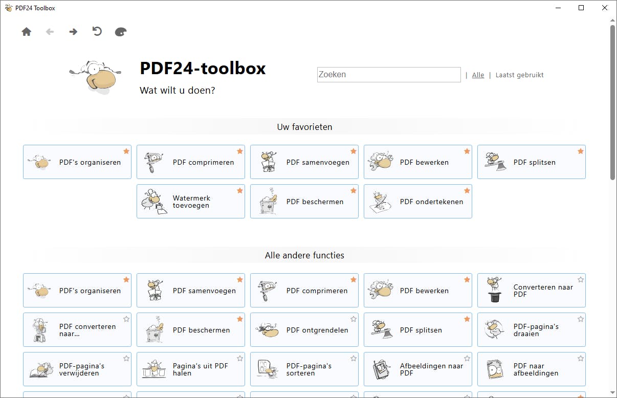 Op het moment van schrijven telt het PDF24 Toolbox-venster bijna veertig onderdelen. Hierdoor oogt de gebruikersomgeving ietwat onoverzichtelijk. Voeg veelgebruikte tooltjes daarom aan een favorietenlijstje toe. Klik hiervoor rechtsboven bij een onderdeel op het sterretje. Dit kleurt nu geel. Nadat je alle favorieten hebt gekozen, kun je PDF24 Toolbox opnieuw laden. Gebruik hiervoor helemaal bovenaan het pictogram met de gebogen pijl. Jouw favorieten staan nu bovenaan.