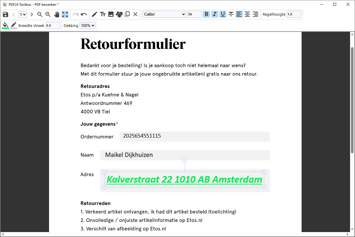 Als een pdf-document invulbare velden heeft, kun je tekst toevoegen. Denk bijvoorbeeld aan een digitaal retourformulier van een webwinkel of contract. Net als Adobe Acrobat Reader herkent PDF24 Reader op eigen houtje invulbare velden. Dubbelklik op zo’n document en klik in het formulier op het veld dat je wilt invullen.