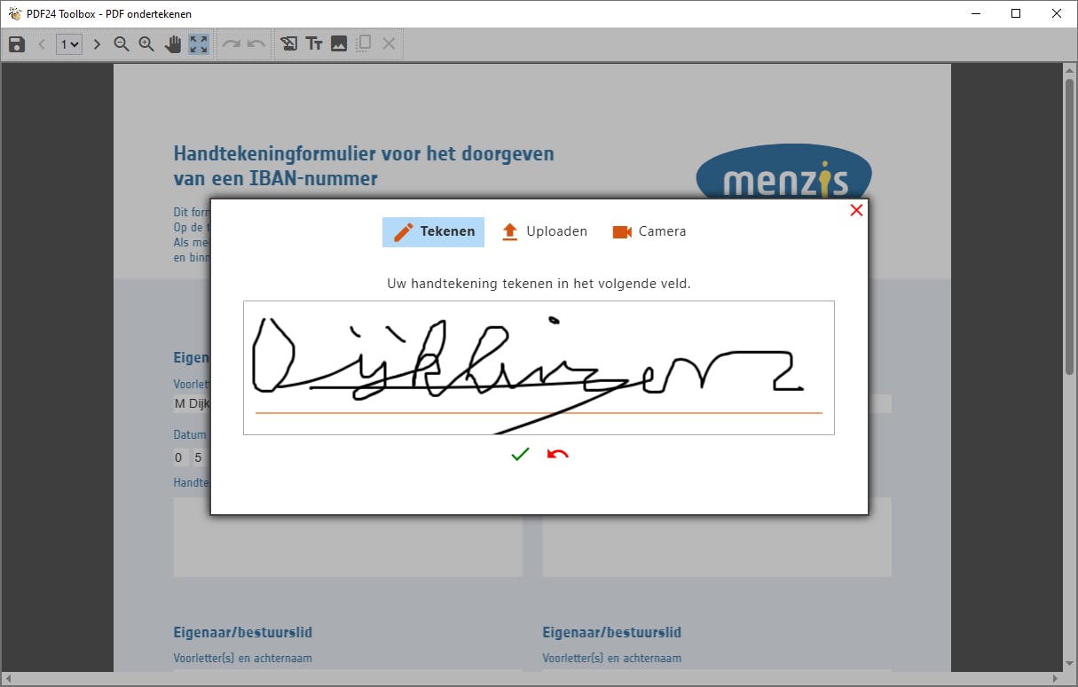Klik in de menubalk op het pictogram met het papier en de ganzenveer (vijfde pictogram van rechts). Je kunt op drie manieren een handtekening toevoegen. Kies Tekenen wanneer je met ingedrukte muisknop of het touchpad een krabbel wilt zetten. Klik vervolgens op het groene vinkje. Heb je je handtekening in het verleden als afbeelding opgeslagen? Kies dan Uploaden / Uploaden en selecteer in Verkenner de afbeelding. Bevestig daarna met Openen. De derde mogelijkheid is om een geschreven handtekening via de webcam vast te leggen. Kies in dat geval Camera en maak een foto.