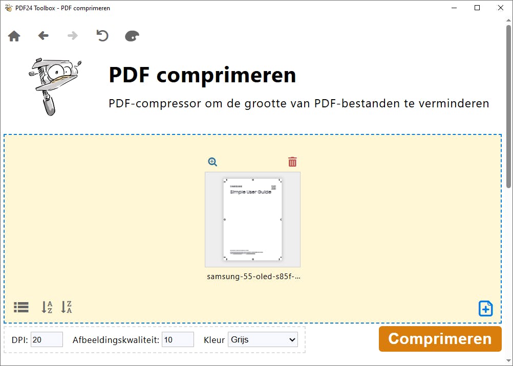 Lange pdf-documenten met veel afbeeldingen zijn vaak behoorlijk groot. Lastig wanneer je zo’n bestand bijvoorbeeld via e-mail wilt versturen. Je kunt een pdf’je een kopje kleiner maken, maar dat gaat wel ten koste van de kwaliteit. Mogelijk zien de letters en afbeeldingen er daarom korreliger uit. Als je de verkleinfunctie evengoed wilt uitproberen, kies je in de PDF24 Toolbox het onderdeel PDF Comprimeren. Klik op Bestanden kiezen, selecteer een groot pdf-document en kies Openen.