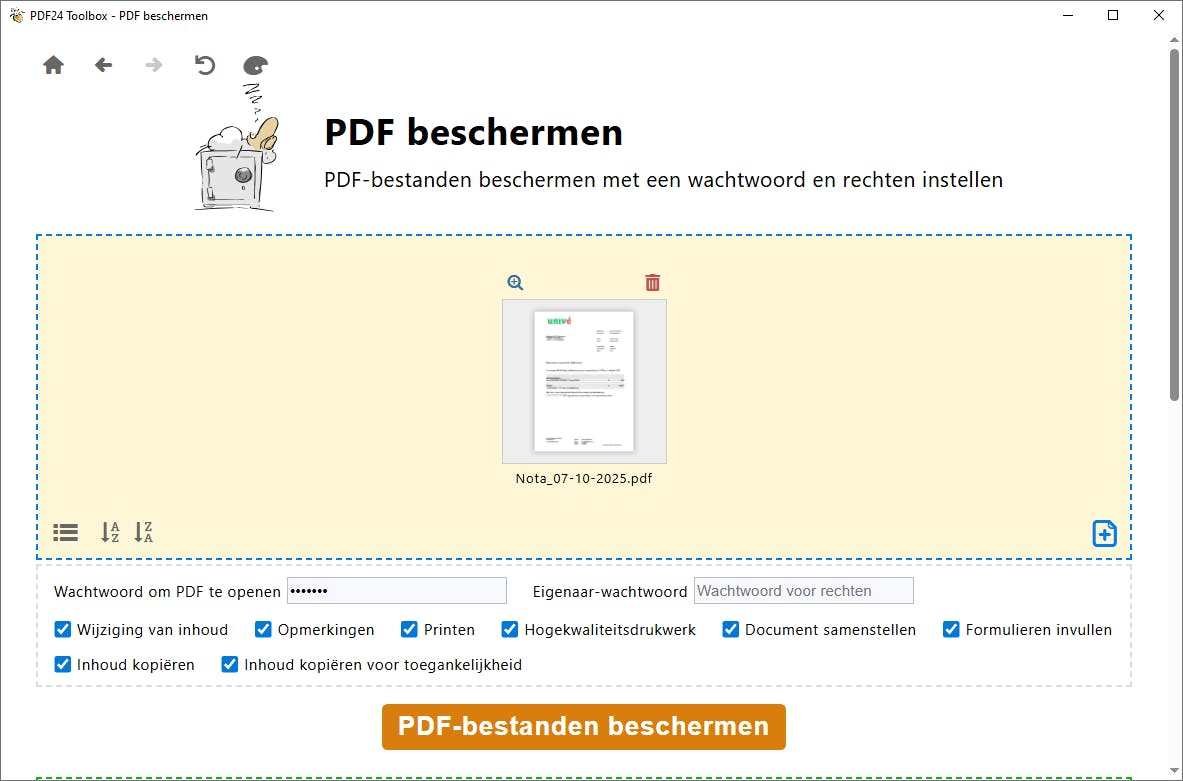 Wanneer je een pdf-document naar het venster sleept, komen er diverse beveiligingsopties tevoorschijn. Klik in het veld achter Wachtwoord om PDF te openen en stel een wachtwoord in. Kies nu PDF-bestanden beschermen. Via Opslaan wijs je een bestandslocatie aan en bevestig je nogmaals met Opslaan. Zodra iemand dit bestand wil openen, verschijnt er eerst een invoerveld voor het wachtwoord.