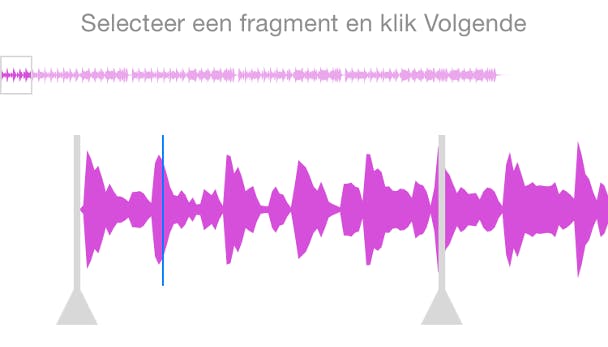 Druk hiervoor op de knop menu linksboven (pictogram met drie horizontale streepjes) en vervolgens op Voeg fragment toe. Je kunt dan een audiofragment uit je iTunes-bibliotheek uploaden. Met de schuifregelaars selecteer je een goed fragment, waarna je drukt op Volgende. Geef je fragment nu een beschrijvende naam en druk op Volgende. Het geluidsfragment is nu toegevoegd aan de bibliotheek van Dubsmash, en je kunt er direct een clipje mee opnemen.