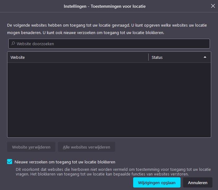 Firefox werkt op een soortgelijke manier. Ga via het hamburgermenu rechtsboven naar Instellingen en vervolgens naar Privacy & Beveiliging. Iets naar onderen vind je het kopje Toestemmingen, waar je via de knop Instellingen… onder Locatie en Meldingen kunt kiezen voor Nieuwe verzoeken om toegang tot uw locatie blokkeren of Nieuwe verzoeken voor het toestaan van notificaties blokkeren. Heb je al een lange lijst staan? Klik dan meteen even op Alle websites verwijderen. Ook in Firefox kun je je camera en microfoon op dezelfde manier aanpakken.