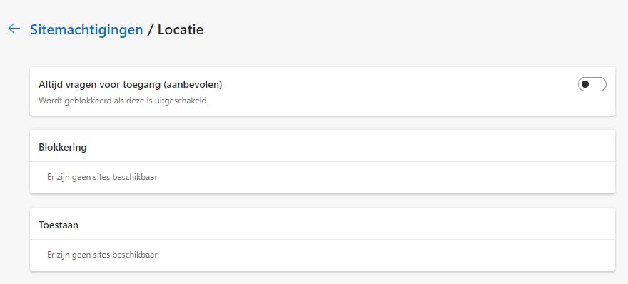 Edge werkt eigenlijk hetzelfde. Via het menu rechtsboven ga je naar Instellingen > Cookies en site machtigingen. Locatie en Meldingen staan standaard op ‘Eerst vragen’ (en Camera en Microfoon trouwens ook). Klik op een item en zet de slider uit, en je wordt niet meer gestoord met verzoekjes.