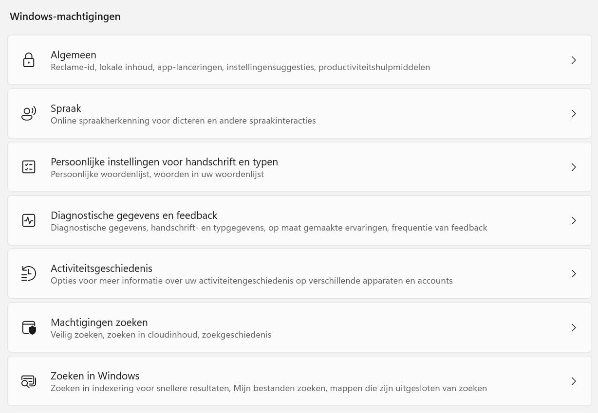 Hoewel de lijst met app-machtigingen lang is, is het verstandig om de tijd te nemen en alle machtigingen door te nemen. Klik op elke machtiging en controleer of je de dienst wilt gebruiken, welke apps hiervan gebruik mogen maken en welke standaardinstellingen je van toepassing wilt laten zijn. Zo zorg je voor totale controle en belangrijker: neem je niet zomaar genoegen met de standaardinstellingen die Windows hanteert.