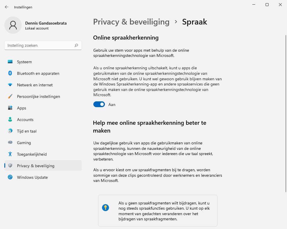 Deze sectie bepaalt of je gebruik wilt maken van online spraakherkenning. Het gaat hierbij overigens niet om de ingebouwde spraakherkenning van Windows 11, maar om een online technologie van Microsoft die soms door externe apps die in Windows 11 zijn geïnstalleerd, kan worden gebruikt. Het inschakelen van de optie is alleen nuttig als je online spraakherkenning gebruikt. In andere gevallen schakel je deze uit privacyoverwegingen het best uit; fragmenten van je stem kunnen bij instemming namelijk worden gebruikt voor analyse om de dienst beter te maken.