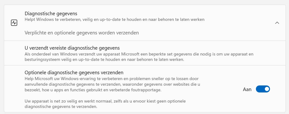 Windows kan tot in detail het gebruik van de computer bijhouden en deze diagnostische gegevens delen met de ontwikkelaars. De informatie wordt gebruikt om het besturingssysteem te verbeteren en bugfixes uit te brengen. Er wordt altijd een set (anonieme) gegevens met Microsoft gedeeld, maar of er ook aanvullende gegevens worden verstuurd, bepaal je zelf. Het gaat hierbij om gegevens over bezochte websites, het gebruik van apps en functies en gedetailleerdere informatie in geval van foutrapportages. Zet de schuif op Uit als je deze informatie niet wilt delen. De instelling heeft geen invloed op de beveiliging van de computer.