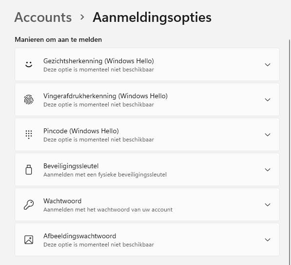 Via het onderdeel E-mail en accounts beheer je de e-mailaccounts binnen Windows 11. Klik op een account en kies Beheren als je zaken als het wachtwoord wilt aanpassen. De pagina die wordt geopend, is afhankelijk van de accountaanbieder. Gebruik je bijvoorbeeld een account voor werk of school, dan wijkt deze af van een consumentenaccount. Je kunt je op verschillende manieren aanmelden bij Windows 11. De beschikbare aanmeldingsopties zijn ook afhankelijk van de computer. In de sectie Manieren om aan te melden zie je de mogelijkheden. Ondersteunt de computer biometrische aanmelding via Windows Hello, zoals het inloggen met beeldherkenning of een vingerscanner, dan kun je in deze sectie onder meer uit Gezichtsherkenning, Vingerafdrukherkenning en Pincode kiezen. In de sectie Extra instellingen bepaal je de aanvullende maatregelen. Zo kun je de computer automatisch op slot zetten zodra je je werkplek verlaat: op basis van de aanwezigheid van bijvoorbeeld de telefoon (die dan niet meer in de buurt is), wordt Windows 11 automatisch vergrendeld. Activeer de optie via Toestaan dat Windows automatisch uw apparaat vergrendelt wanneer u niet aanwezig bent. Handig is de optie Mijn opnieuw opstartbare apps automatisch opslaan en opnieuw opstarten als ik me opnieuw aanmeld: wanneer Windows opnieuw wordt gestart, bijvoorbeeld door Windows Update, worden de geopende programma’s automatisch hersteld. Wil je niet dat je aanmeldingsgegevens worden gebruikt om de computer opnieuw op te starten na een update, dan zet je de schuif op Uit bij Mijn aanmeldingsgegevens gebruiken om het instellen automatisch te voltooien na een update.
