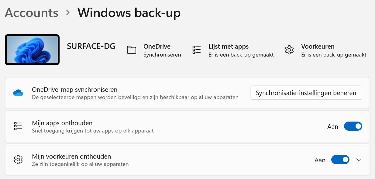 Zekerheid voor alles: maak een back-up van je persoonlijke bestanden. Windows gebruikt hiervoor OneDrive. Via de knop Synchronisatie-instellingen beheren kun je aangeven welke gebruikerslocaties (zoals Bureaublad, de mappen Documenten en Afbeeldingen) moeten worden gesynchroniseerd. Via de optie Mijn apps onthouden sla je op welke apps je hebt geïnstalleerd: meld je je bij Windows aan op een ander apparaat, dan toont Windows de app-lijst. In de sectie Mijn voorkeuren onthouden kun je aangeven welke andere gebruikersgegevens op alle apparaten beschikbaar moeten zijn: Wachtwoorden, Taalvoorkeuren en Andere Windows-instellingen.
