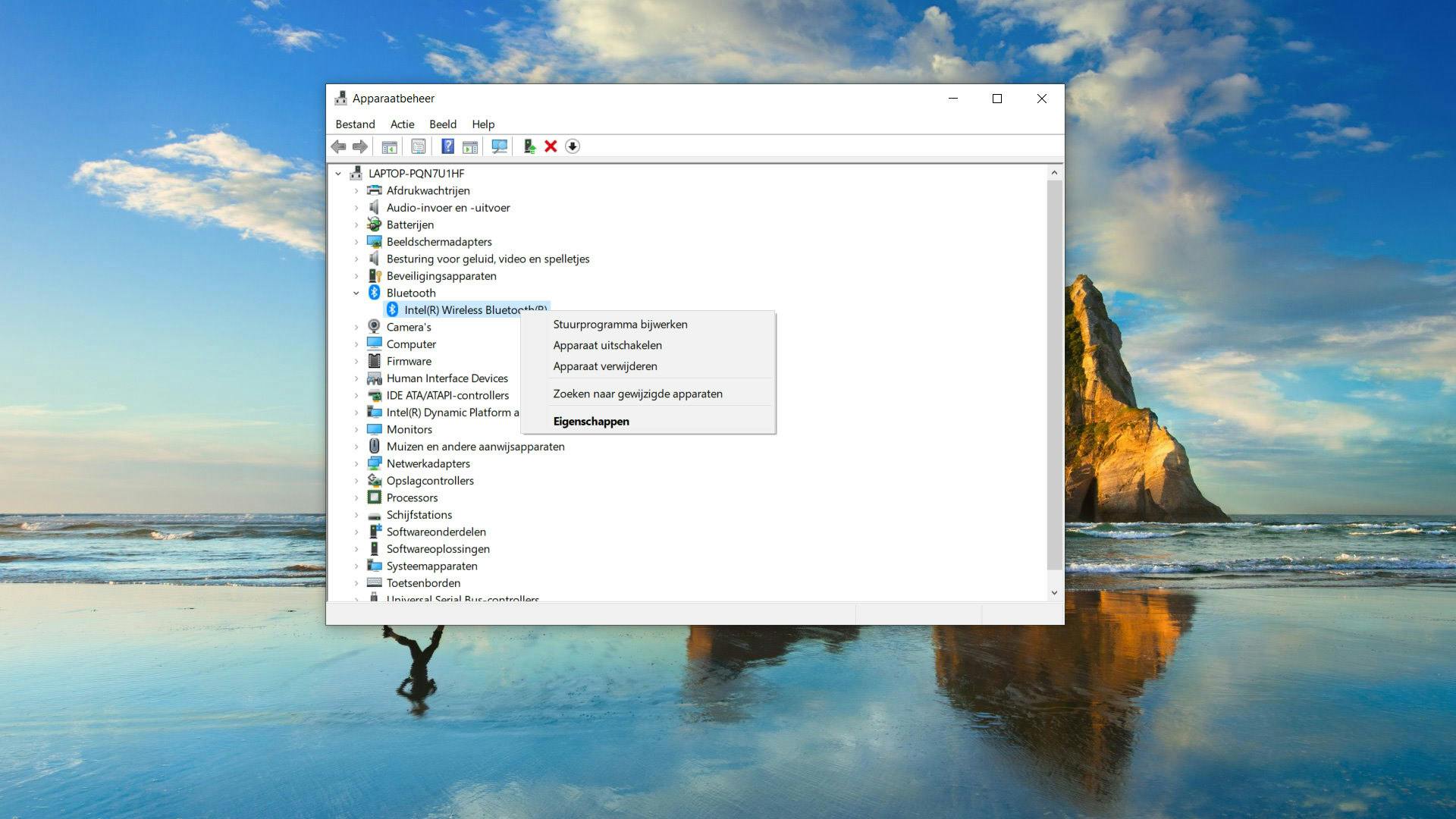 Wellicht wordt het probleem veroorzaakt door gecorrumpeerde bluetooth-drivers. Dan moeten we die drivers opnieuw installeren. Druk daarvoor op Win + X en ga dan naar Apparaatbeheer. Dubbelklik op de optie Bluetooth en klik met je rechtermuisknop op de getoonde driver. Schakel de driver uit en schakel hem daarna weer in. Start nu je pc opnieuw op. Verhelpt dit het probleem niet, dan kun je de driver ook verwijderen (via het menu van de rechtermuisknop). Druk nu op de Actieknop bovenin en selecteer Zoeken naar gewijzigde apparaten. Start de computer opnieuw op om de veranderingen door te voeren.