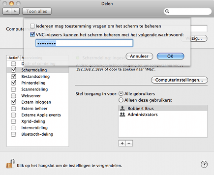 Ga naar Systeemvoorkeuren en klik op Delen. Selecteer Schermdeling en klik op de knop Computerinstellingen. Selecteer VNC-viewers kunnen het scherm beheren met het volgende wachtwoord en vul een wachtwoord in.