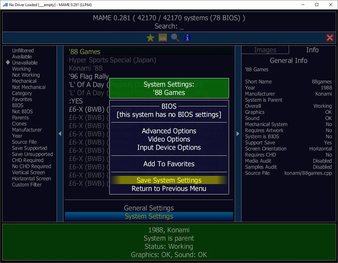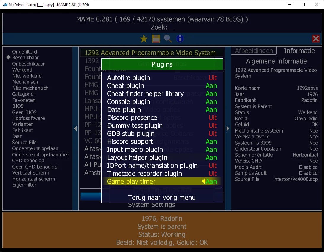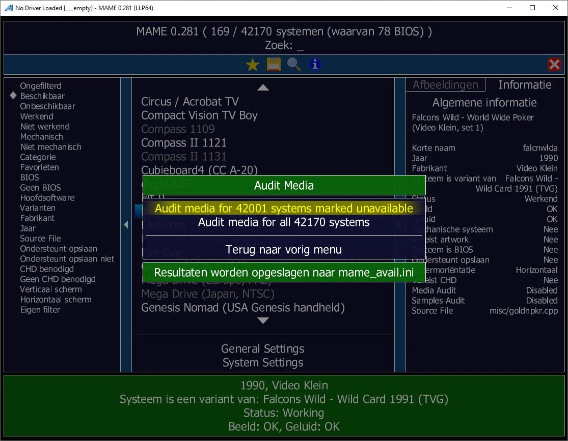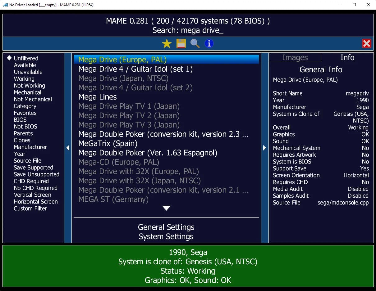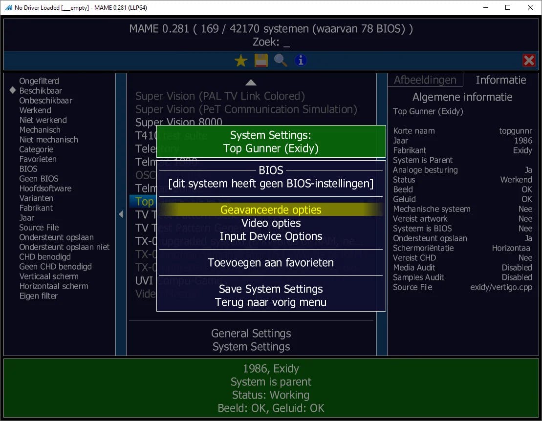 Je kunt alvast de status van een geselecteerde emulator controleren. Als onderin beeld Status: Working verschijnt, kan MAME deze spelcomputer of arcadekast goed nabootsen. Is dat niet het geval, dan voegt de emulatiesoftware wellicht later ondersteuning toe via een update. Controleer verder ook of het beeld en geluid goed werken. In dat geval staat er OK achter respectievelijk Graphics en Sound.