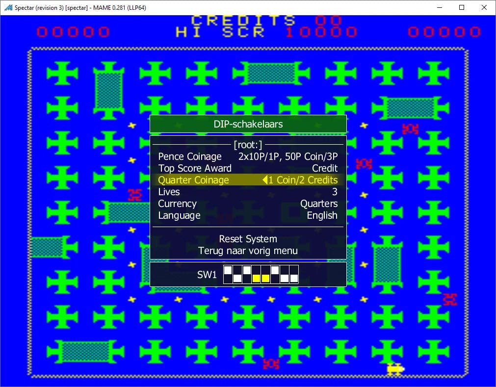 Druk binnen de spelomgeving op de Tab-toets en ga naar DIP-schakelaars. De beschikbare instellingen zijn afhankelijk van het gekozen arcadespel. Vaak kun je het aantal levens en/of credits opvoeren. Soms zijn er ook opties om de gametijd te verlengen, een andere taal te kiezen en de moeilijkheidsgraad te wijzigen. Tot slot kun je het geluid van de 'arcadekast' wellicht aan- of uitzetten. Klaar? Klik dan achtereenvolgens op Terug naar vorig menu en Close Menu.