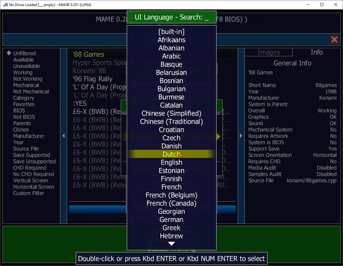 De voertaal is weliswaar standaard Engels, maar er is ook een Nederlandse vertaling beschikbaar. Ga naar General Settings / Customize UI en dubbelklik op Language. Klik vervolgens twee keer op Dutch. Zodra je nu Return to Previous Menu kiest, verandert het menu direct naar het Nederlands. Bevestig met Instellingen opslaan en sluit het menu af. Houd er rekening mee dat niet alle onderdelen in MAME correct zijn vertaald.